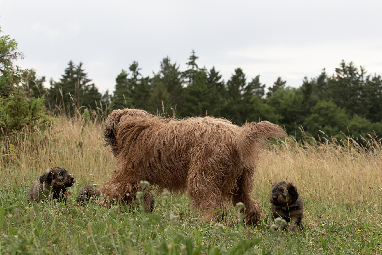 Die ersten Tage hat Goya die Wurfkiste nur verlassen um sich zu erleichtern. In der Zwischenzeit legt sie ich auch ausserhalb der Wurfkiste und lässt die Welpen in Ruhe schlafen. Sobald sich aber in der Kiste etwas regt ist sie sofort wieder drin. Goya macht das sehr gut und ist eine fürsorgliche Mutter.